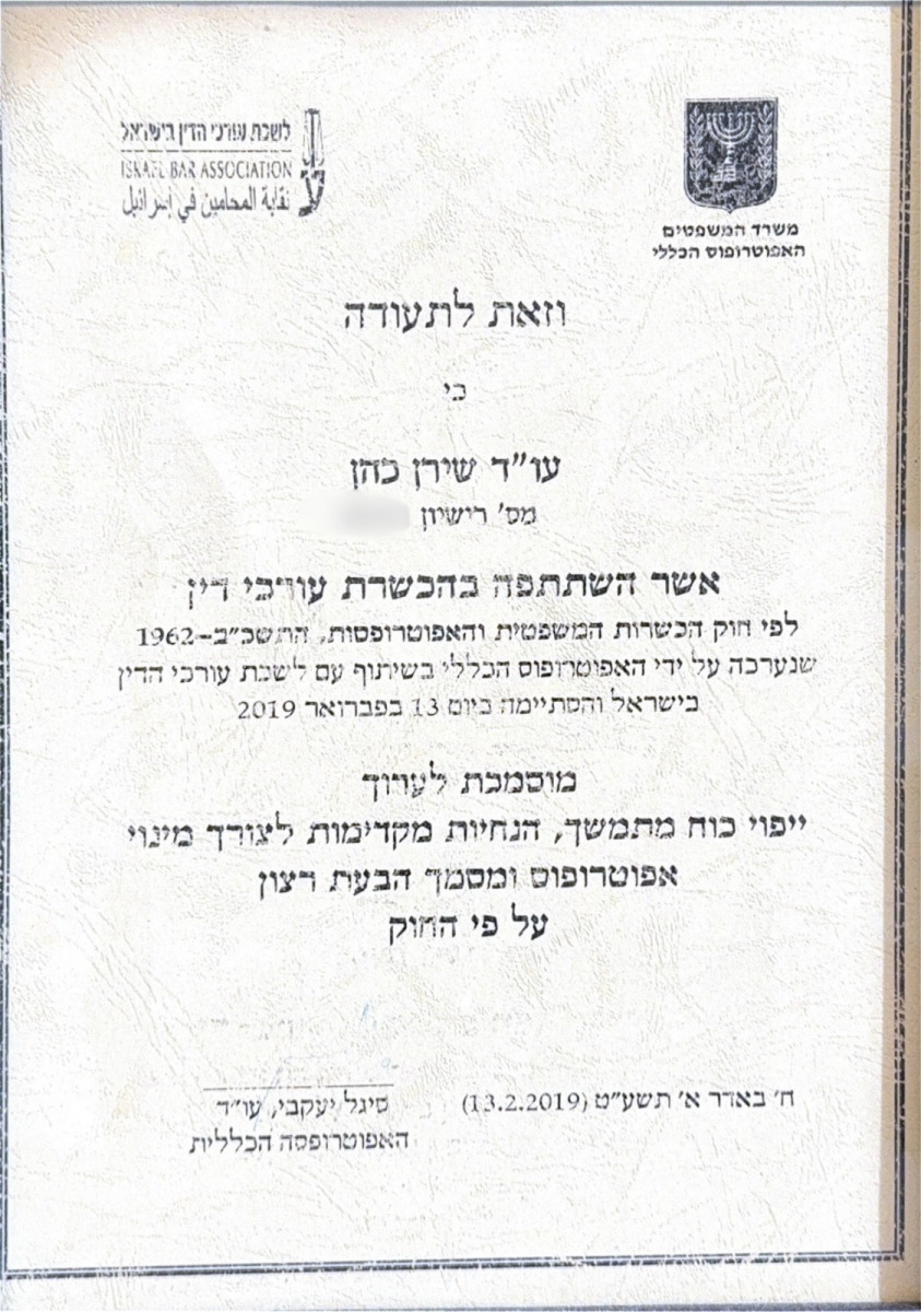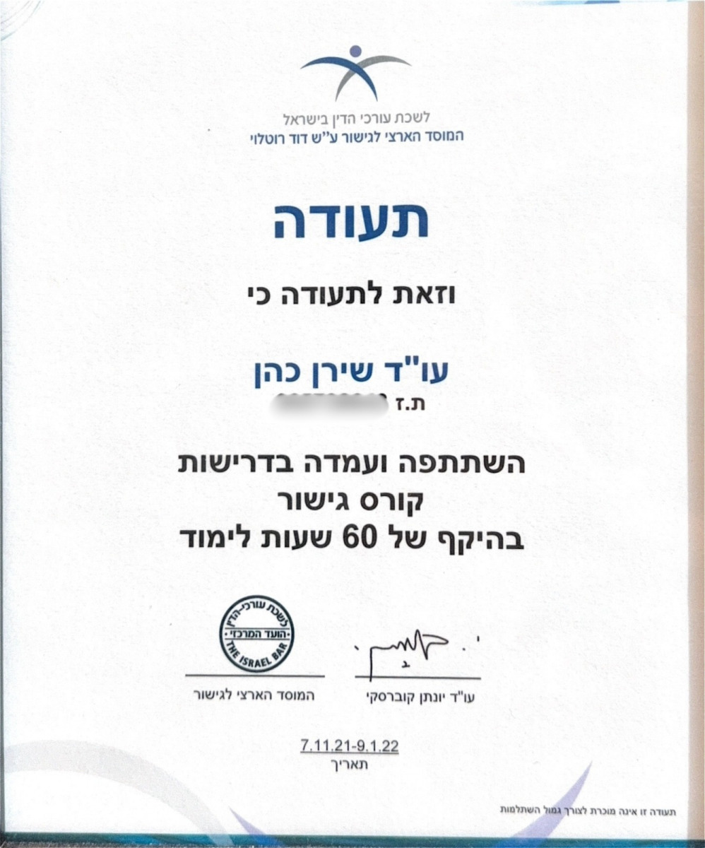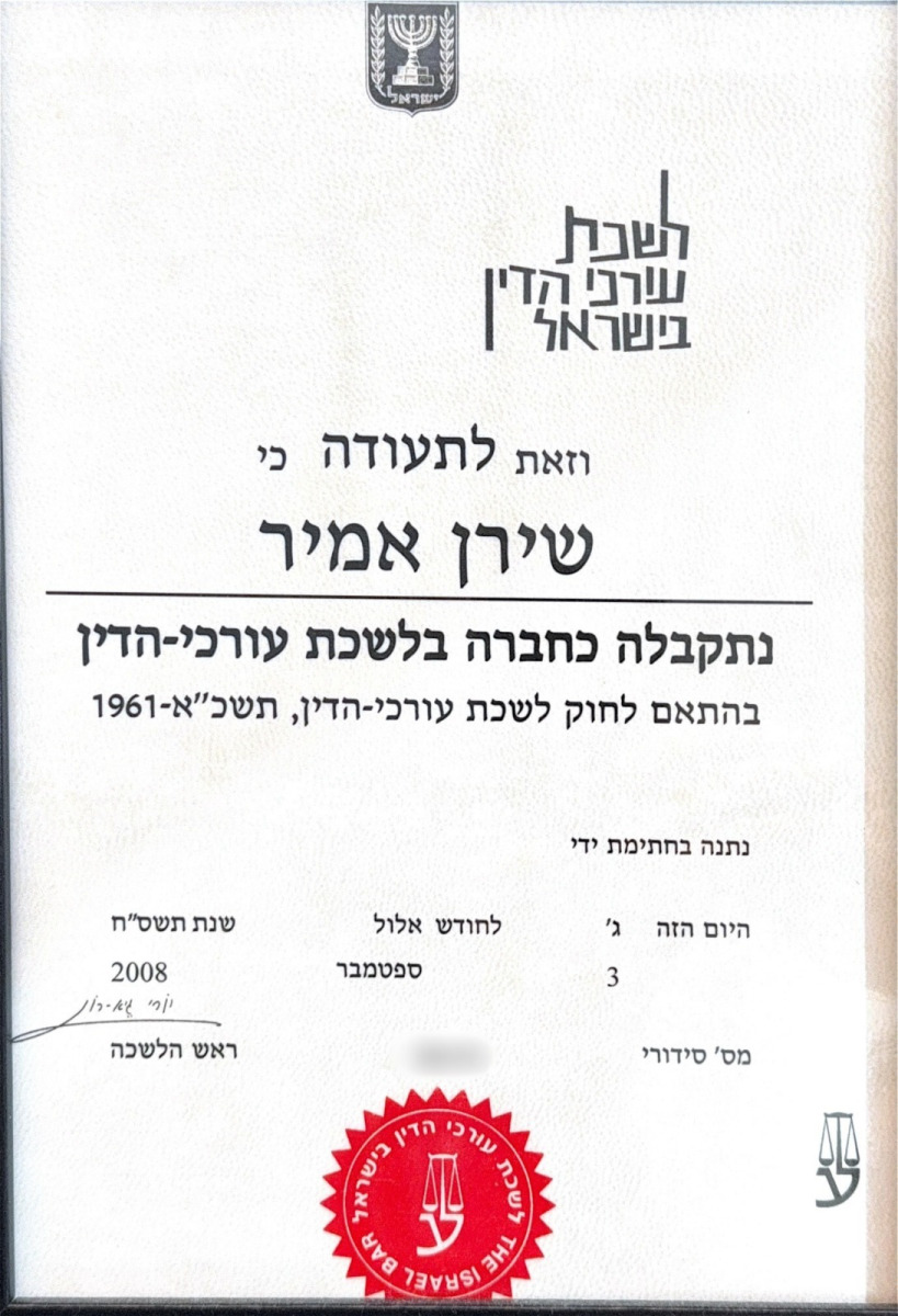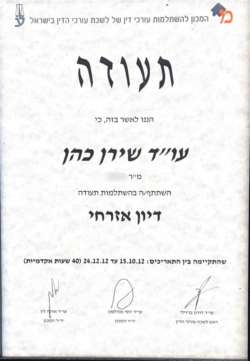 עו"ד שירן כהן, נשואה ואמא ל-3 בנים, הוסמכה כעו"ד מטעם לשכת עורכי הדין בישראל בשנת 2008.