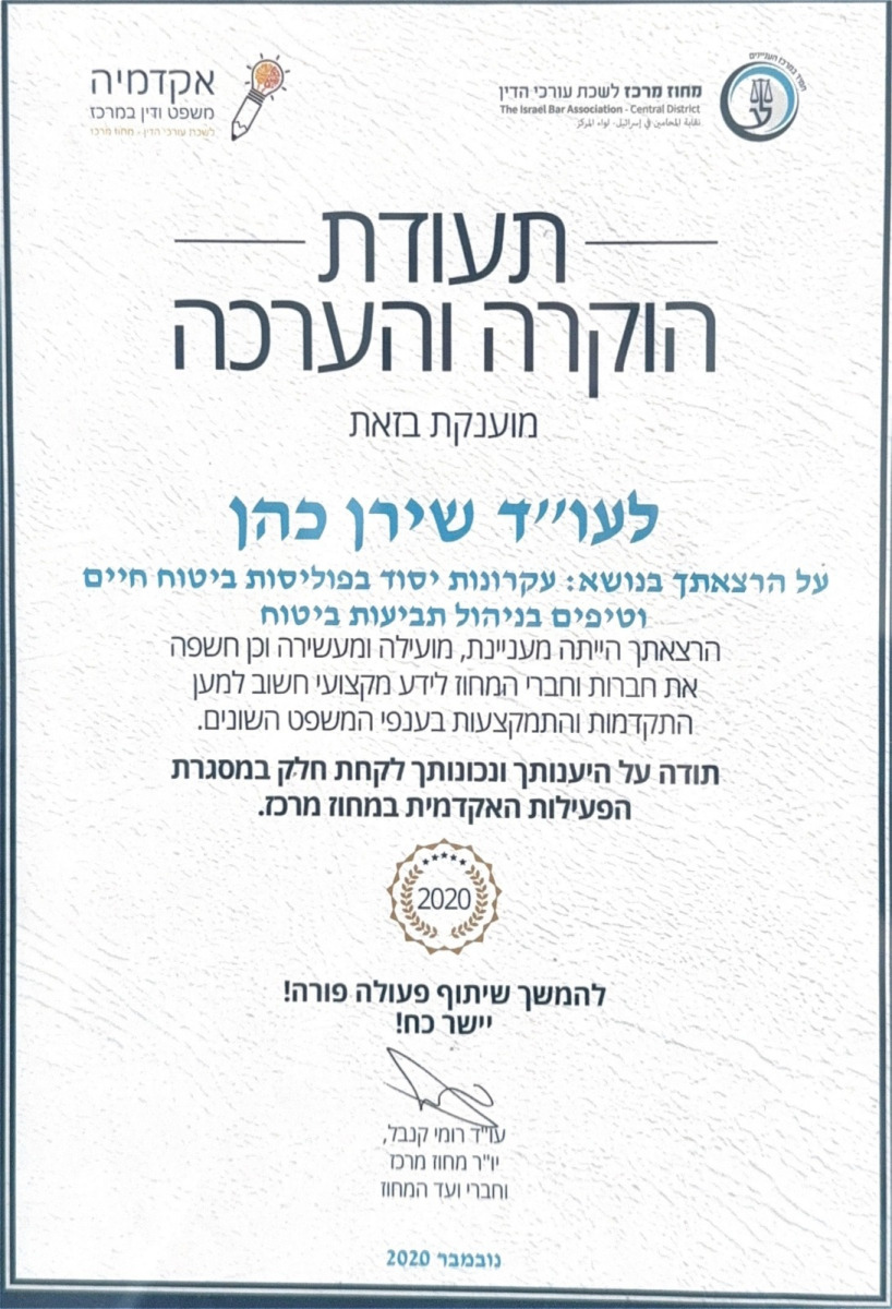 עו"ד כהן הינה בעלת וותק של כ- 17שנים בניהול תביעות ביטוח ונזיקין.